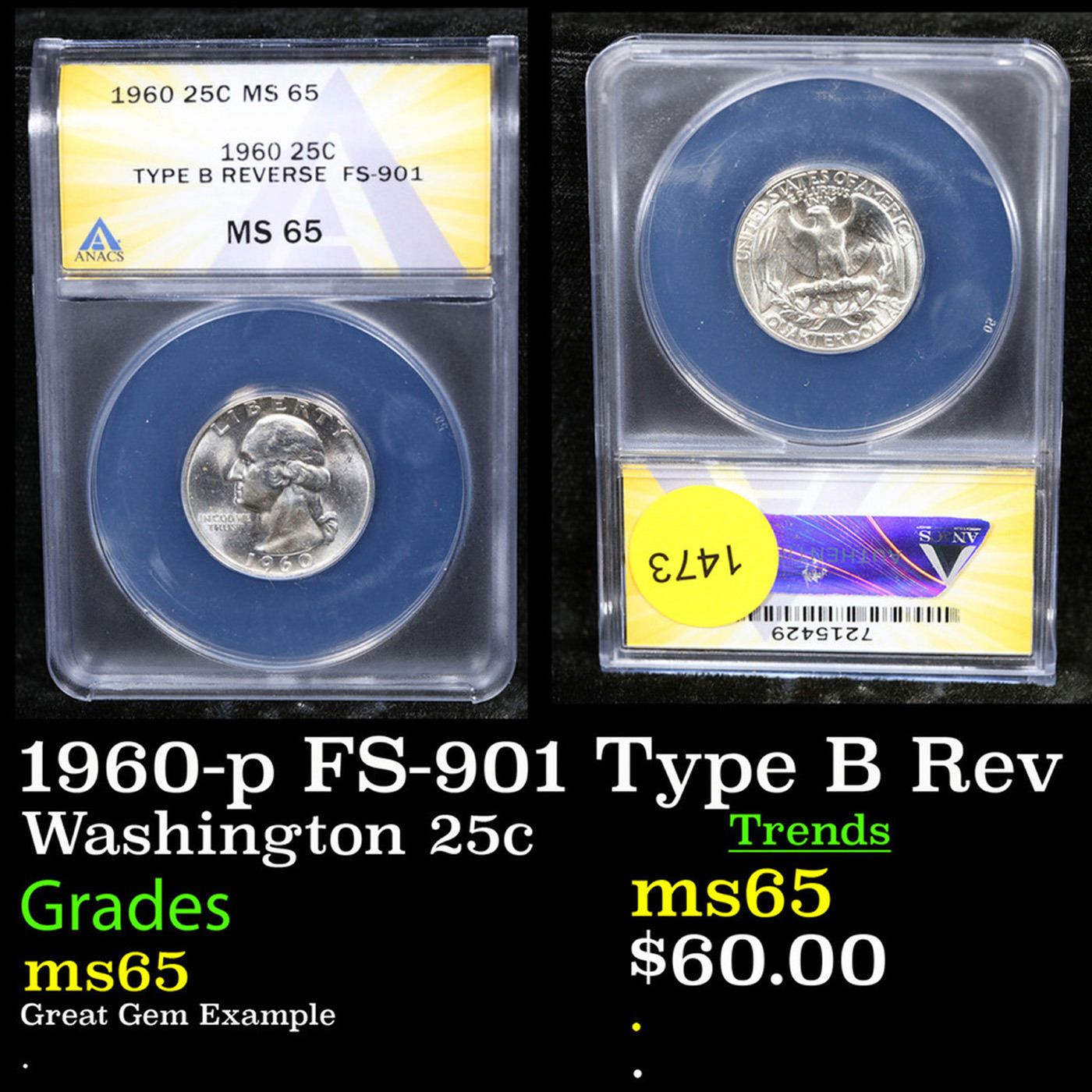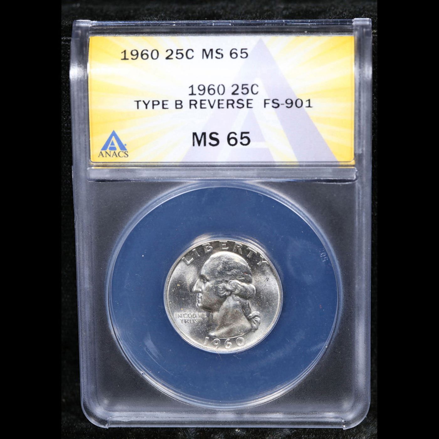 ANACS 1960-p FS-901 Type B Rev Washington Quarter 25c Graded ms65 By ANACS.