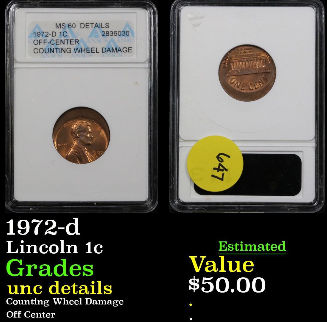 ANACS 1972-d Off Center Counting Wheel Damage Lincoln Cent 1c Graded Unc Details By ANACS.