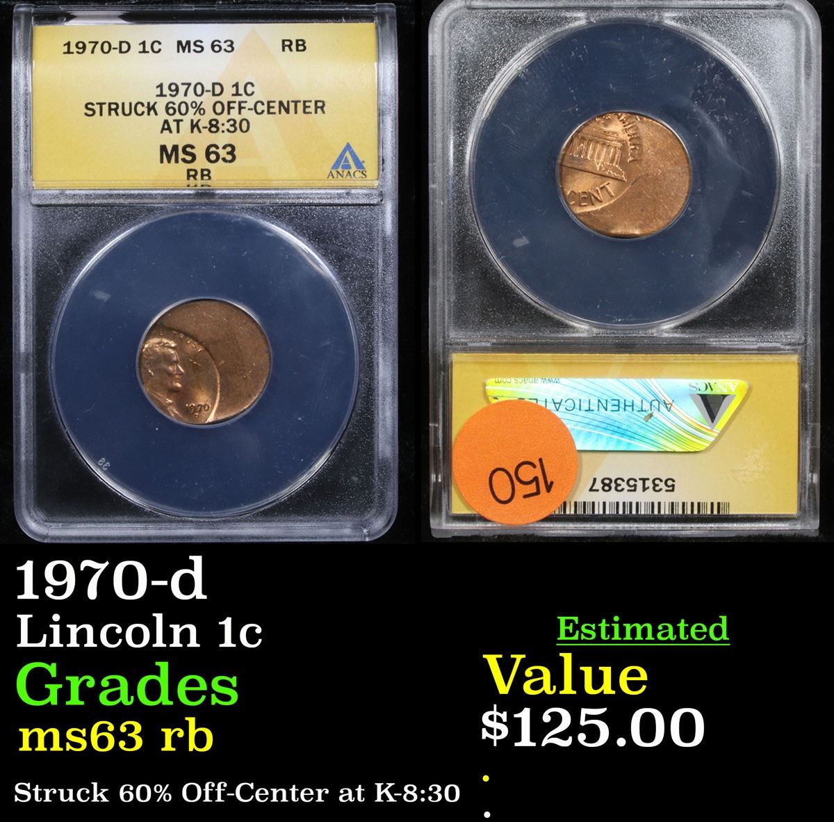 ANACS Mint Error 1970-d struck 60% off center Lincoln Cent 1c Graded ms63 rb By ANACS.