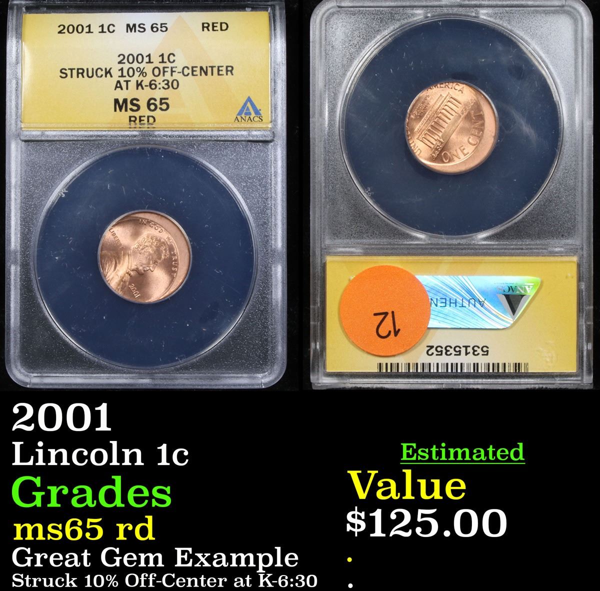 ANACS Mint Error 2001 struck 10% off-center Lincoln Cent 1c Graded ms65 rd By ANACS.