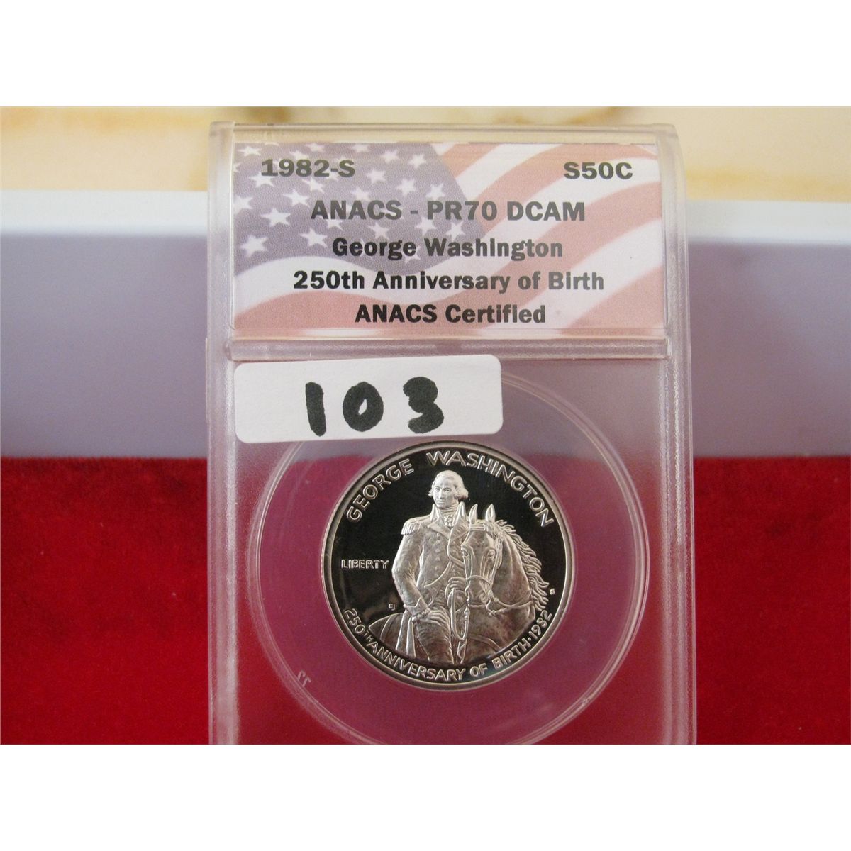 ANACS PR-70 Proof. The 1982 George Washington Commemorative Half Dollar marked the beginning of the Modern Commemorative Coin Program. The coin was issued to celebrate the 250th anniversary of the birth of George Washington. Coins were struck in 90% silver and represented the first 90% silver coins to be produced by the United States Mint since 1964.