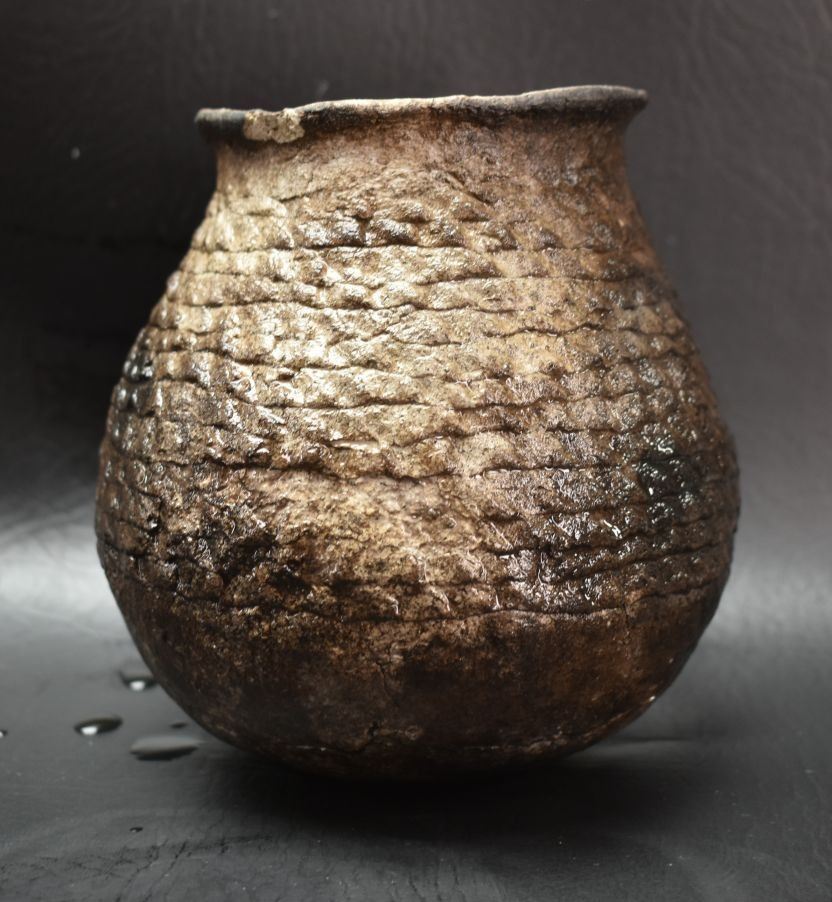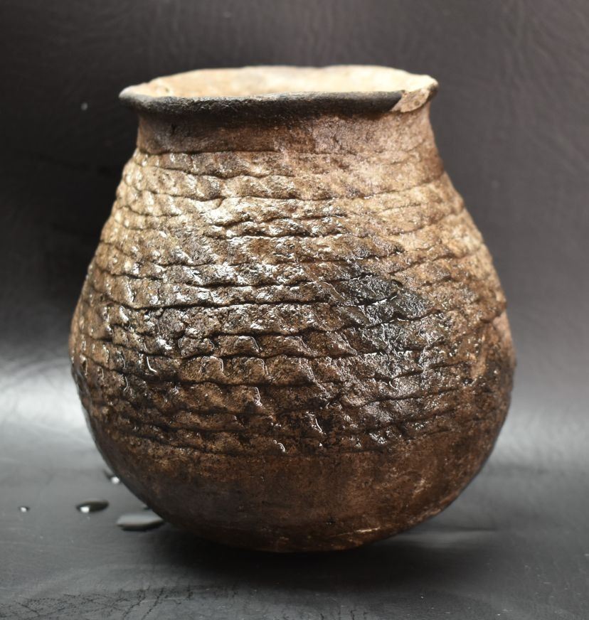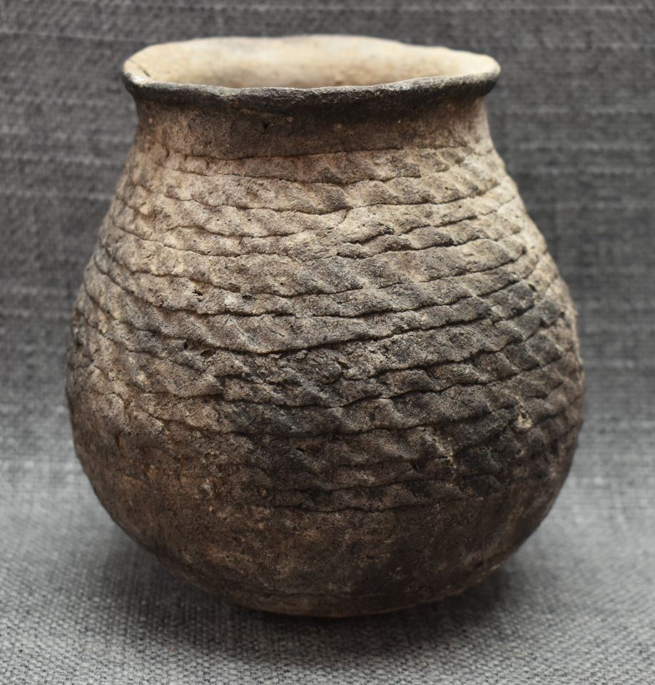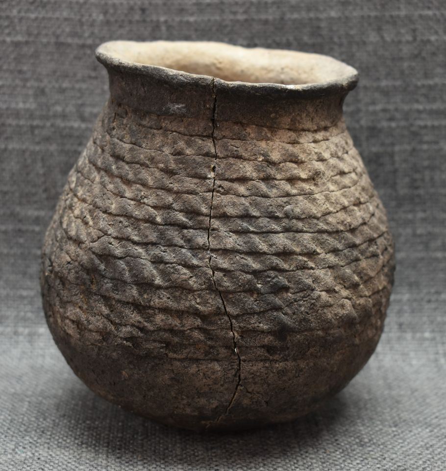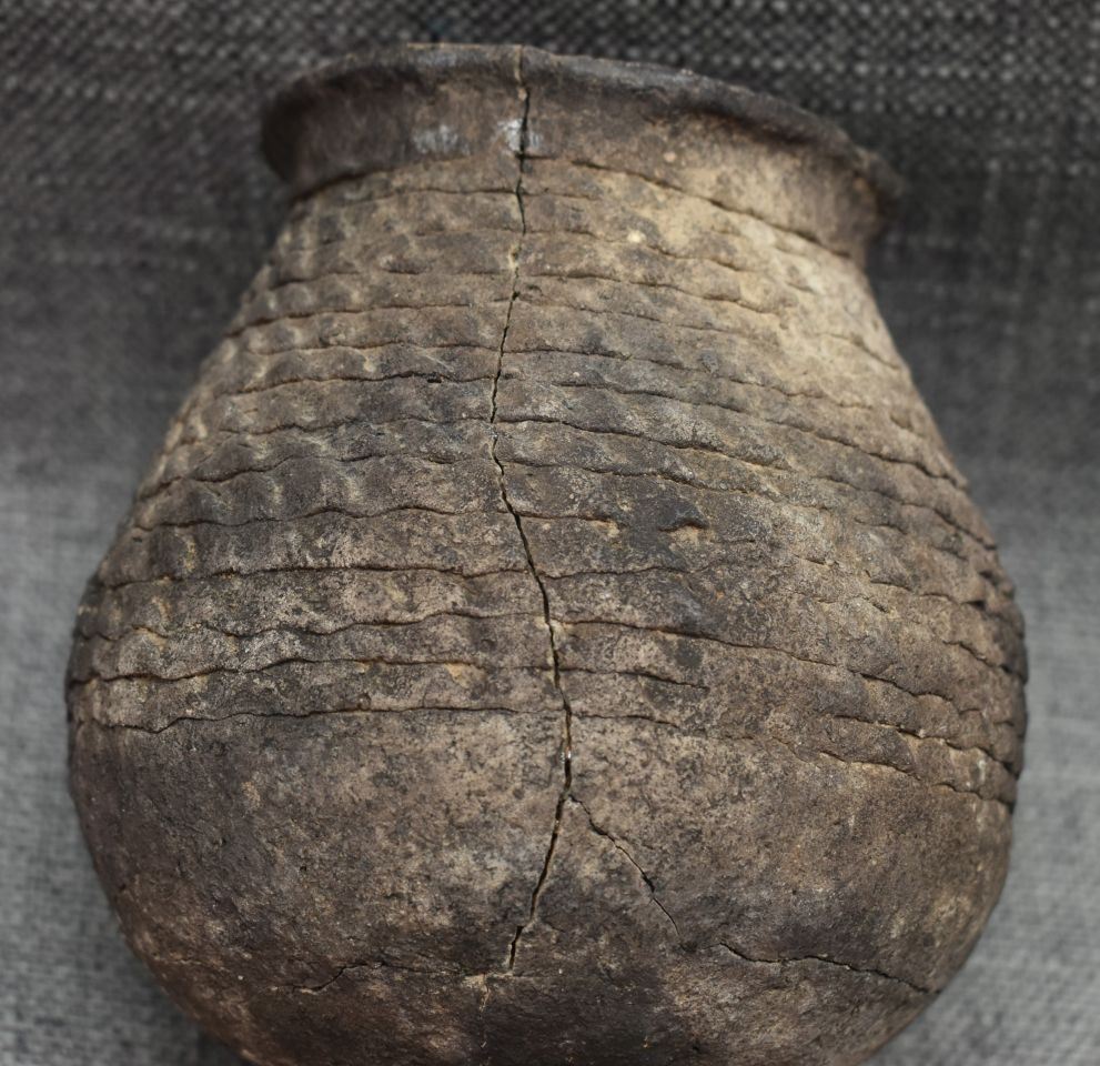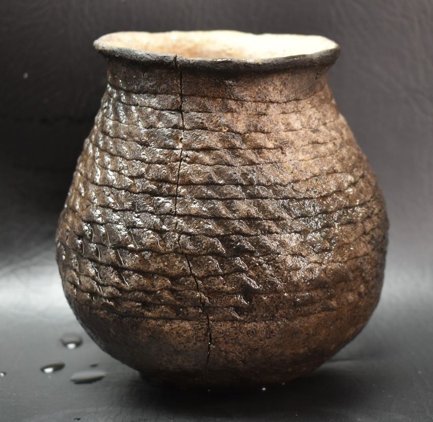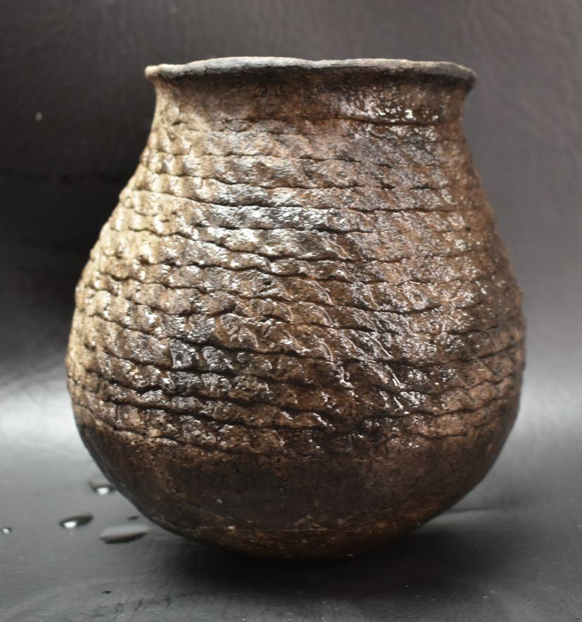 prehistoric Anasazi, hand coiled with corrugated design 5" x 4.5" as found condition, has cracks.