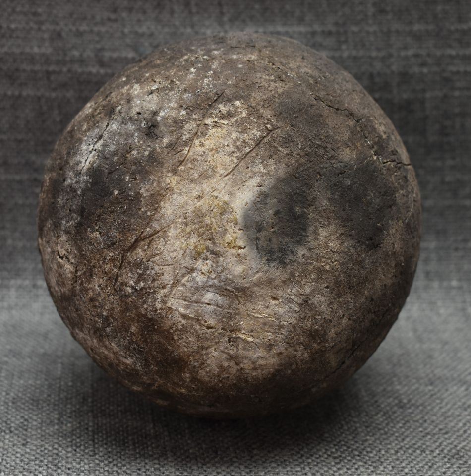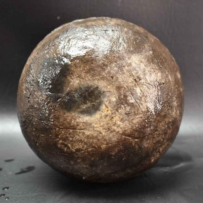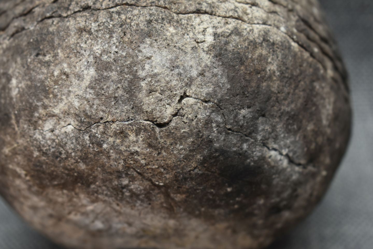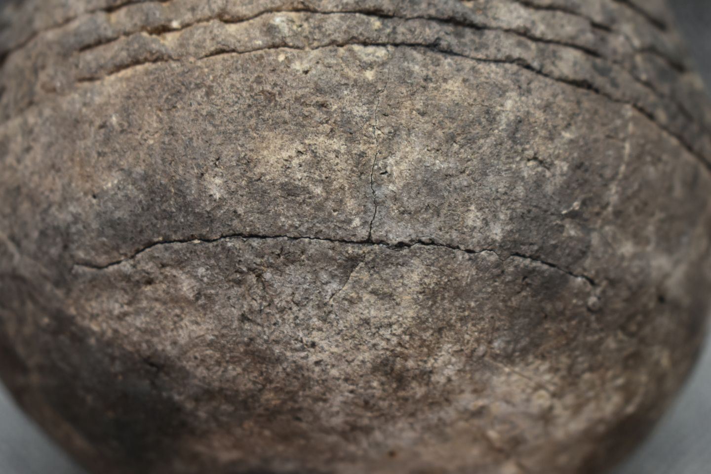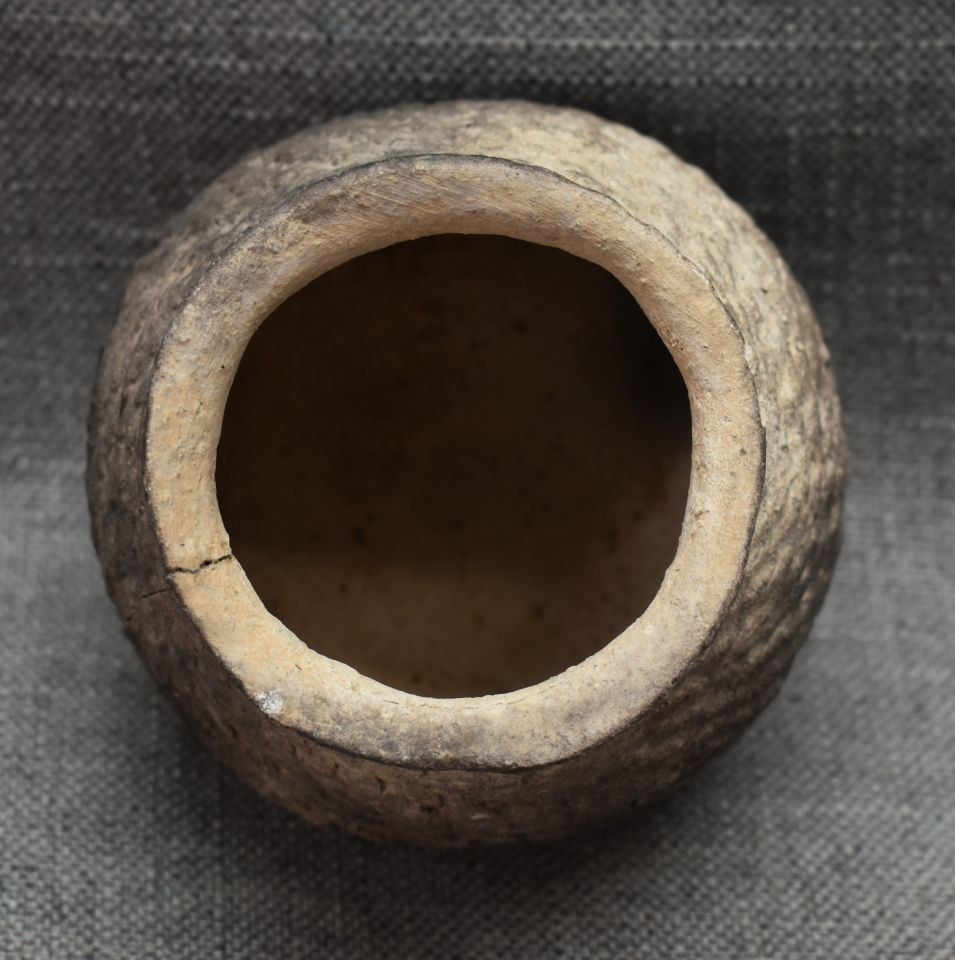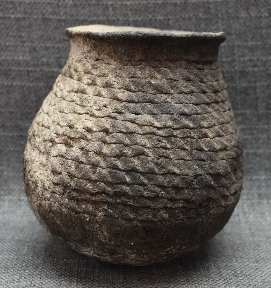 prehistoric Anasazi, hand coiled with corrugated design 5" x 4.5" as found condition, has cracks.
