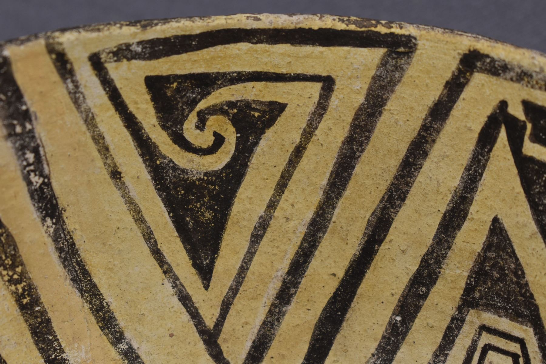Pre Historic Anasazi Indian. Hand coiled an painted black on white design pottery bowl. 3.75'' x 8'' has restoration see pictures