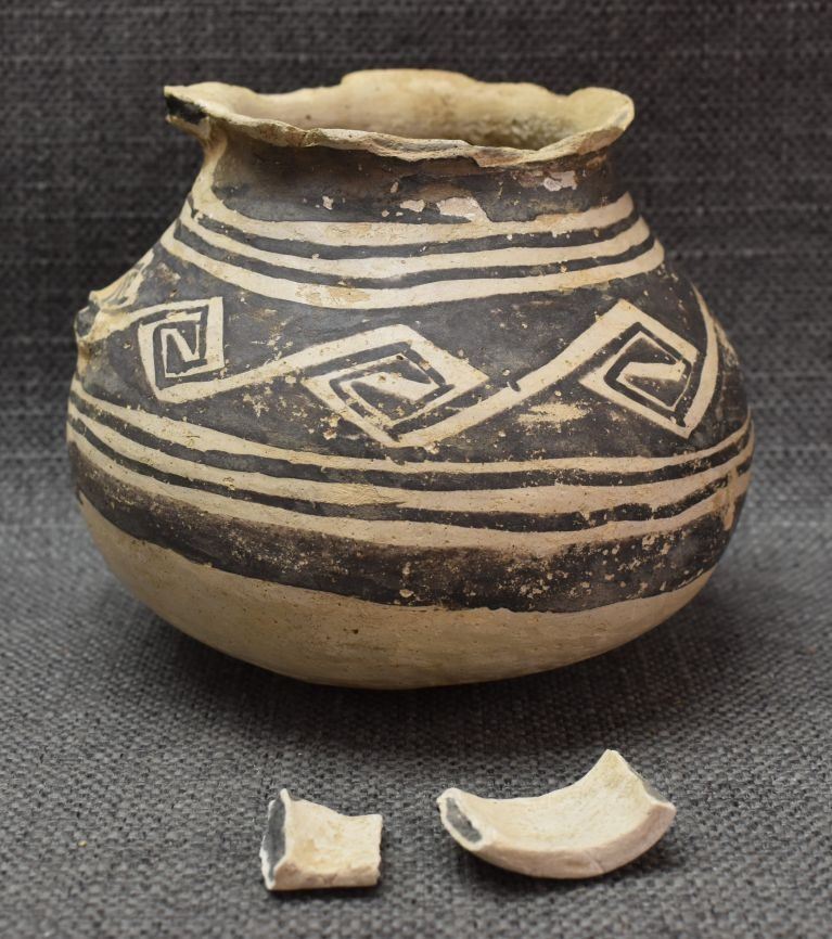 prehistoric Anasazi Indian hand coiled and painted black on white design 4" x 5" as found condition