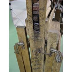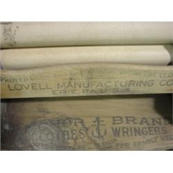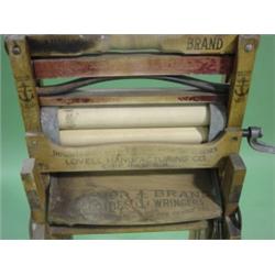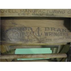 ANCHOR BRAND FOLDING BENCH WRINGER. Marked on base "Lovell Manufacturing Co.-Erie, PA. U.S.A." 47" H, 15.25" W