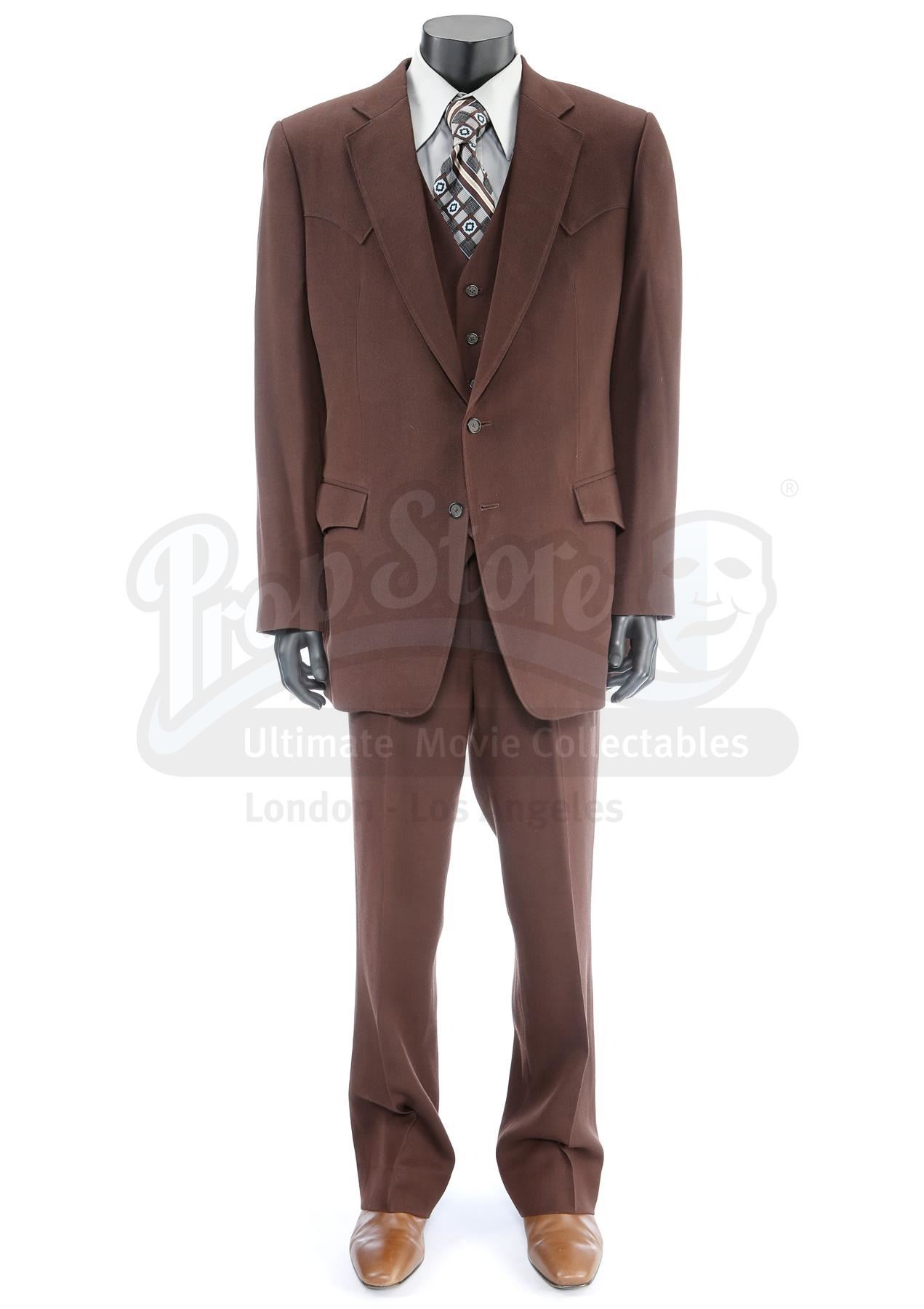 This suit is labelled "Champ Kind Change 6" and consists of a dark brown woollen jacket; a matching pair of slacks labelled "HS Anchorman II 1/21/13"; a matching vest with a belted back; a green cotton blend button-up shirt; a blue-and-brown plaid Qiana tie; and a pair of tan leather Giorgio Brutini zip-up boots marked "Champ" (size 12.5). There are minor stains on the jacket and trousers.