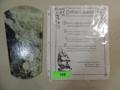 ANCIENT 6000BC MULTI-COLORED JADE CHINESE AX MONEY XIA DYNASTY. DISCOVERED IN THE WATERS NEAR SUMATRA. 11"L. INCLUDES COA FROM SIR ROBERT F MARX UNDERWATER ARCHEAOLOGIST. AS SHOWN. VIEW PICTURE FOR DETAIL.