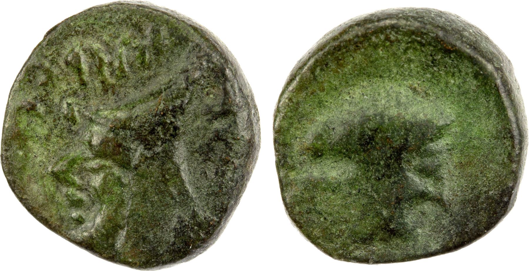 ANCIENT ARMENIA: Mithradates, ca. 180-170 BC, AE chalkous (1.34g), king's bust left, wearing the bashlyk, crude Armenian legend around // draped femail bust; unpublished variety but several examples are now filed on ACSearch, VF, RRR, ex Dr. Dirk Löer Collection. Attribution to Mithradates is tentative.