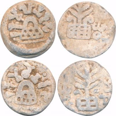 Chutus of Banavasi, Mulanandasa, Lead (2), 16.19g, 15.19g, Obv: Eight-arched hill with circular Brahmi legend, 'Rajño Mulanandasa', Rev: Tree in railing in eight compartments, Srivatsa symbol to right. Very fine+. 2 coins.