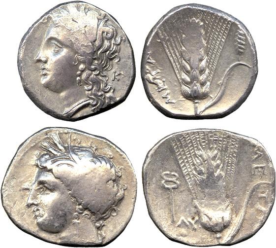 ANCIENT COINS. Greek. Lucania, Metapontum, Silver Staters (2), head of Demeter left, rev barley-ear. A little softly struck on high points, otherwise nearly extremely fine. (2)