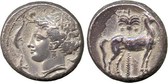 ANCIENT COINS. Greek. Siculo-Punic (c.345-315 BC), Silver Tetradrachm, wreathed head of Arethusa left, dolphins around, rev horse standing right, before palm-tree (SNG Cop 966). A little off-centre, light porosity, about very fine.