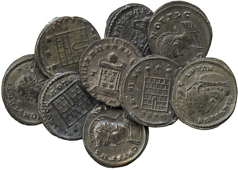 ANCIENT COINS. Roman. AE Folles (9), London mint, comprising issues of Constantine I (AD 307-337), Crispus (Caesar, AD 317-326), and Constantius II (AD 337-361). Very fine to nearly extremely fine. (9)