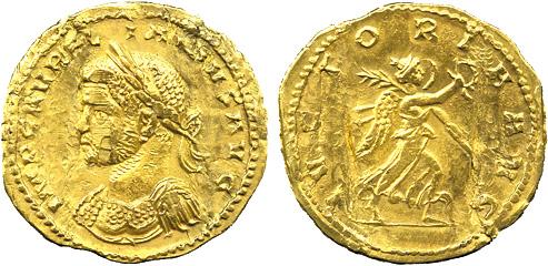 ANCIENT COINS. Roman. Aurelian (AD 270-275), Gold Aureus, IMP C AVRELIANVS AVG, laureate and cuirassed bust left, rev VICTORIA AVG, Victory advancing right, holding wreath and palm, 5.25g (RIC 14 var). Heavily scratched and marked from mounting, about very fine, rare.