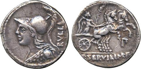 ANCIENT COINS. Roman. P. Servilius Rullus (100 BC), Silver Denarius, bust of Minerva left, wearing Corinthian helmet and aegis, rev Victory in biga right, holding palm-branch (Cr 328/1). Toned, good very fine.