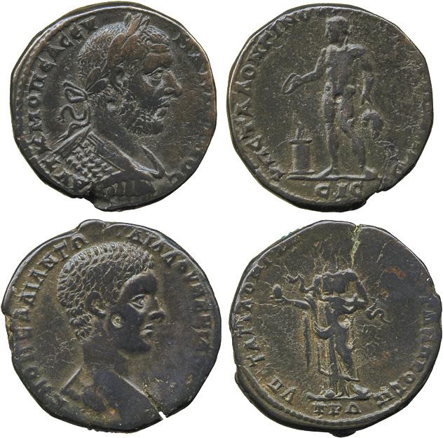 ANCIENT COINS. Roman. Roman Provincial AE, Nikopolis, Moesia Inferior (2), of Macrinus (AD 217-218), AE 25mm; Diadumenian (AD 218), AE 27mm. Very fine. (2)