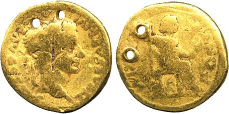 ANCIENT COINS. Roman. Tiberius, Gold Aureus, Indian imitation, TI CAESAR DIVI AVG F AVGVSTVS, laureate head right, rev PONTIF M[A]XIM, female figure seated right, holding sceptre and branch, 7.41g (cf RIC 29). Twice pierced, cut on obverse and wavy flan, fair.