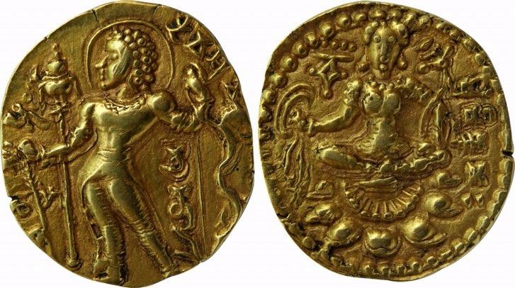 Gupta, Chandra Gupta II, Gold Dinar, 7.99g, "Archer" type, Obv: Nimbate king standing wearing a Dhoti in Tribhanga pose, holding a strung bow in one hand and an arrow in the other; Garuda banner in the background and Brahmi legend "Deva Shri Ma… Guptah" in exergue, Brahmi "Chandra" below the hand holding the bow, Rev: Goddess Lakshmi seated cross legged on lotus, with lotus in one hand and the other holding a noose, Brahmi legend "Shri Vikramah" in the right field and Tamgha in the left (Altekar Class II, var. A). Extremely fine+, extremely rare in this grade.