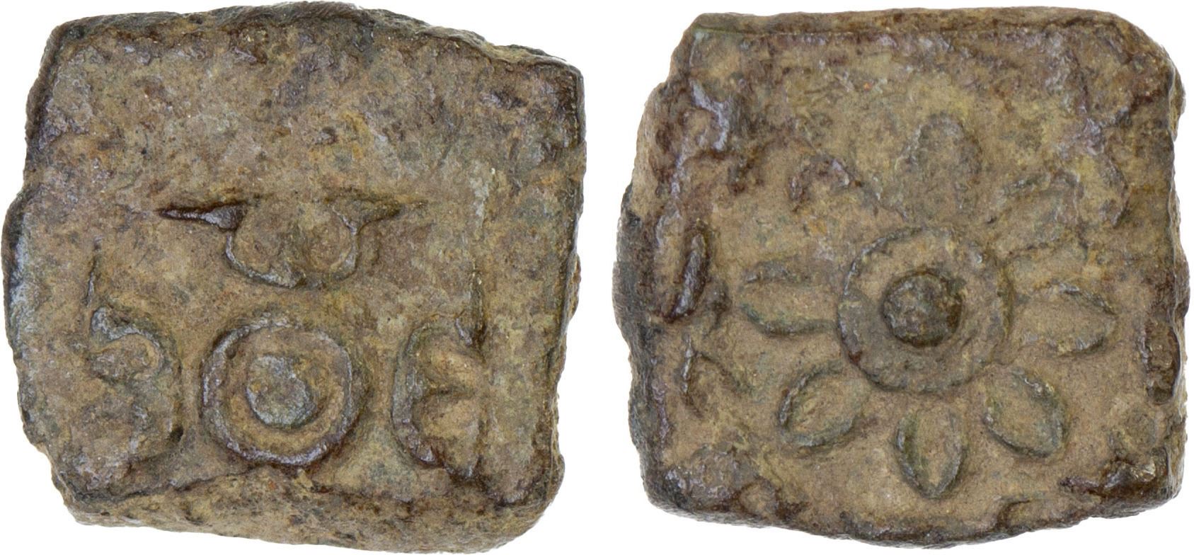 ANCIENT INDIA: Anonymous, perhaps 1st century BC, AE square coin (0.6g), Mitch-, 8-petal flower // annulet with pellet, surrounded by 4 "W" like symbols, choice VF, R.