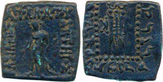 Indo Greeks, Apollodotos I, Copper, 8.92g, Obv: Apollo standing holding bow and arrow, Greek legend "BASILEOS APOLLODOTOU SOTEROS" around, Rev: Tripod of Apollo in dotted border, monogram to left, Kharoshthi legend "Maharajasa Apaladatasa Tratarasa" around (BN series 6). Very fine, rare.