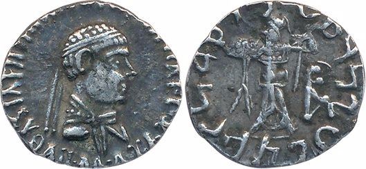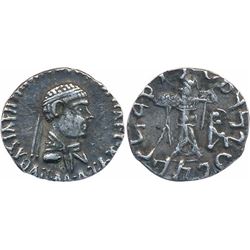 Indo-Greek, Apollodotos II, Silver Drachm, 2.29g, Obv: Diademed bust of king to right, Greek legend "BASILEOS SOTEROS KAI PhILOPATOROS APOLLODOTOU" partly visible around, Rev: Athena Alkidemos standing facing left, monogram to right, Kharoshthi legend "Maharajasa Tratarasa Apaladatasa" around (BN series 2). Very fine+.