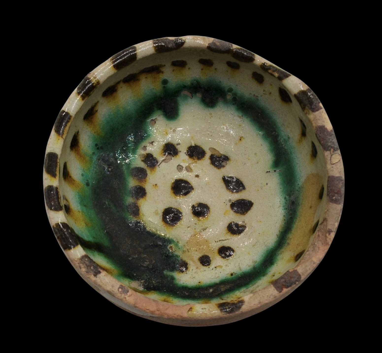 A RARE INTACT SMALL ANCIENT ISLAMIC ABBASID GREEN SPLASHED "DOT" POTTERY BOWL. CIRCA 9TH-10TH CENTURY, of chinese tang style.