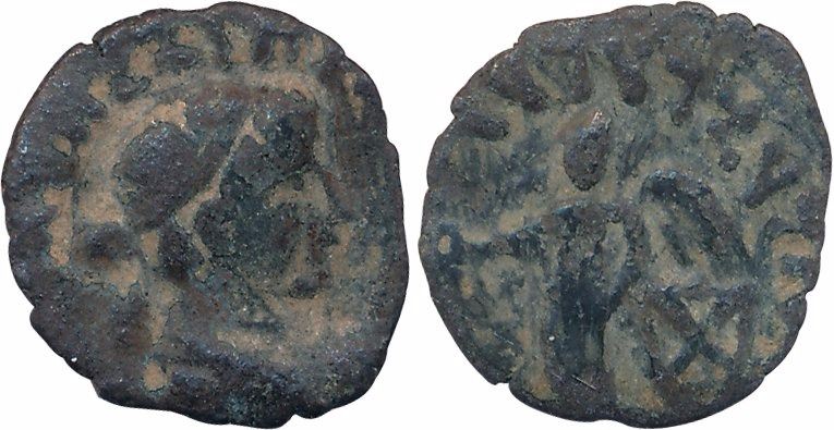 Kushan, Kujula Kadphises, Copper, 1.72g, Obv: Diademed bust of king to right, traces of Greek legend around, Rev: Winged Nike facing to left, traces of Kharosthi legend around (Pieper# 1171). Uncleaned, very fine, rare.