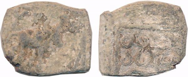Pre-Satavahana, Sebaka, Vidarbha Region, Lead, 2.80g, Uninscribed, Obv: Bull walking to right, above triangular hedaded symbol and taurine, Rev: Triratna and Taurine symbol. Very fine.