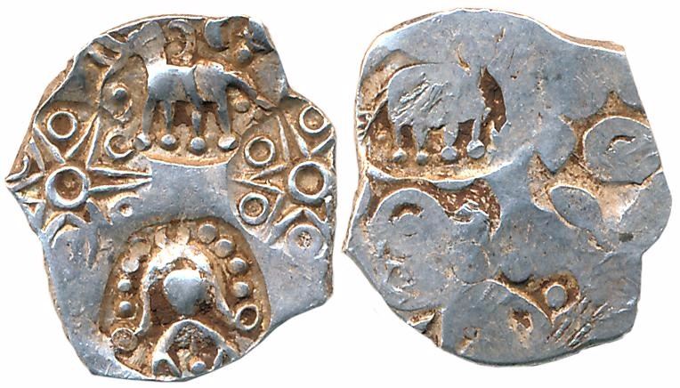 Punch Marked, Attributed to Vidarbha Janapada, Silver 1/2 Karshapana, 1.68g, four symbol series of ABCC type, Obv: 1 X Elephant walking to left joined crescent above, 1 X downward Taurine within dotted border and 2 X six pointed star with small circle on each corner, Rev: Traces of earlier symbols. Extremely fine, rare.