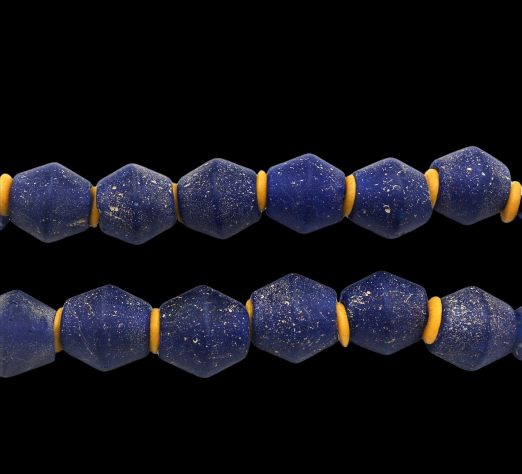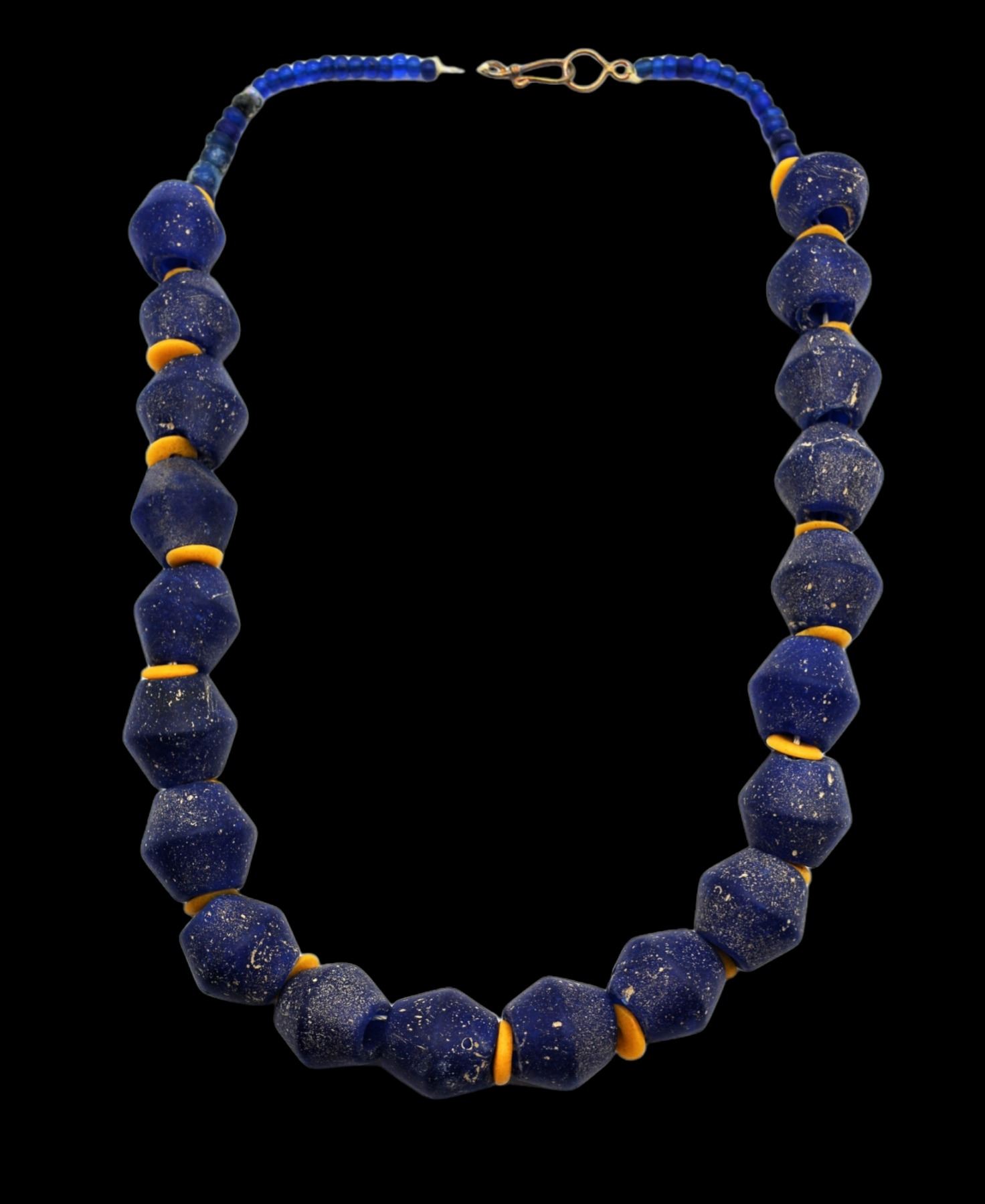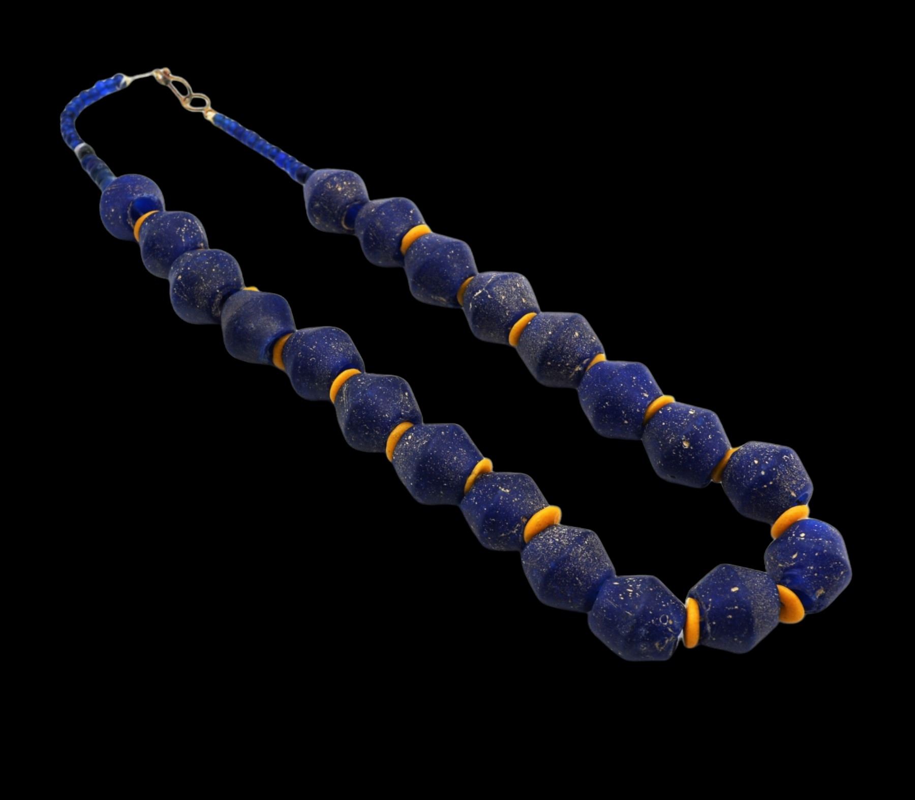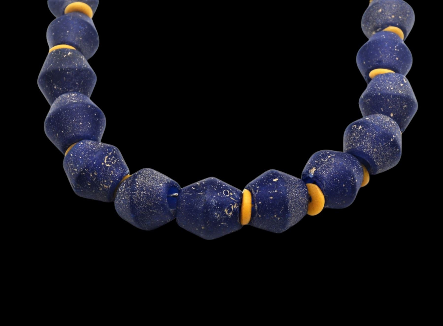 AN EXTREMELY RARE LARGE ANCIENT GREEK OR ROMAN BLUE GLASS BEADS NECKLACE CIRCA 2ND/1ST MILLENNIUM BC TO 1ST CENTURY AD. Extremely Fine Qualities & Huge Sizes. Historians believe the link between humans and Glass beads stretches back more than 6,500 years. The gem was treasured by the ancient civilizations of Mesopotamia, Egypt, China, Greece, and Rome. They valued it for its vivid, exquisite color, and prized it as much as they prized other blue gems like sapphire and turquoise. The same was true as far back as 700 BC, when the region was part of a country known as Bactria. Total Beads = 20 Beads, Bead size is 20 mm .