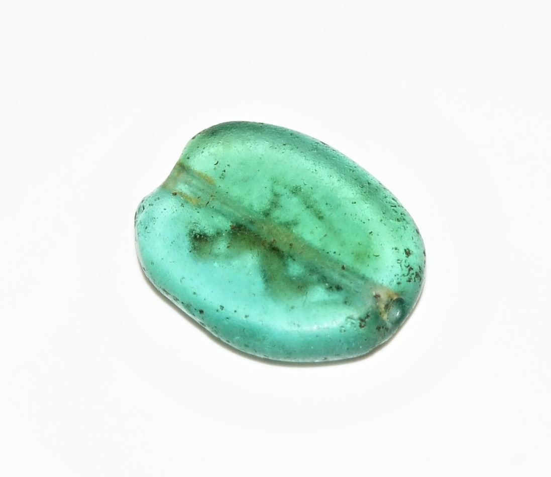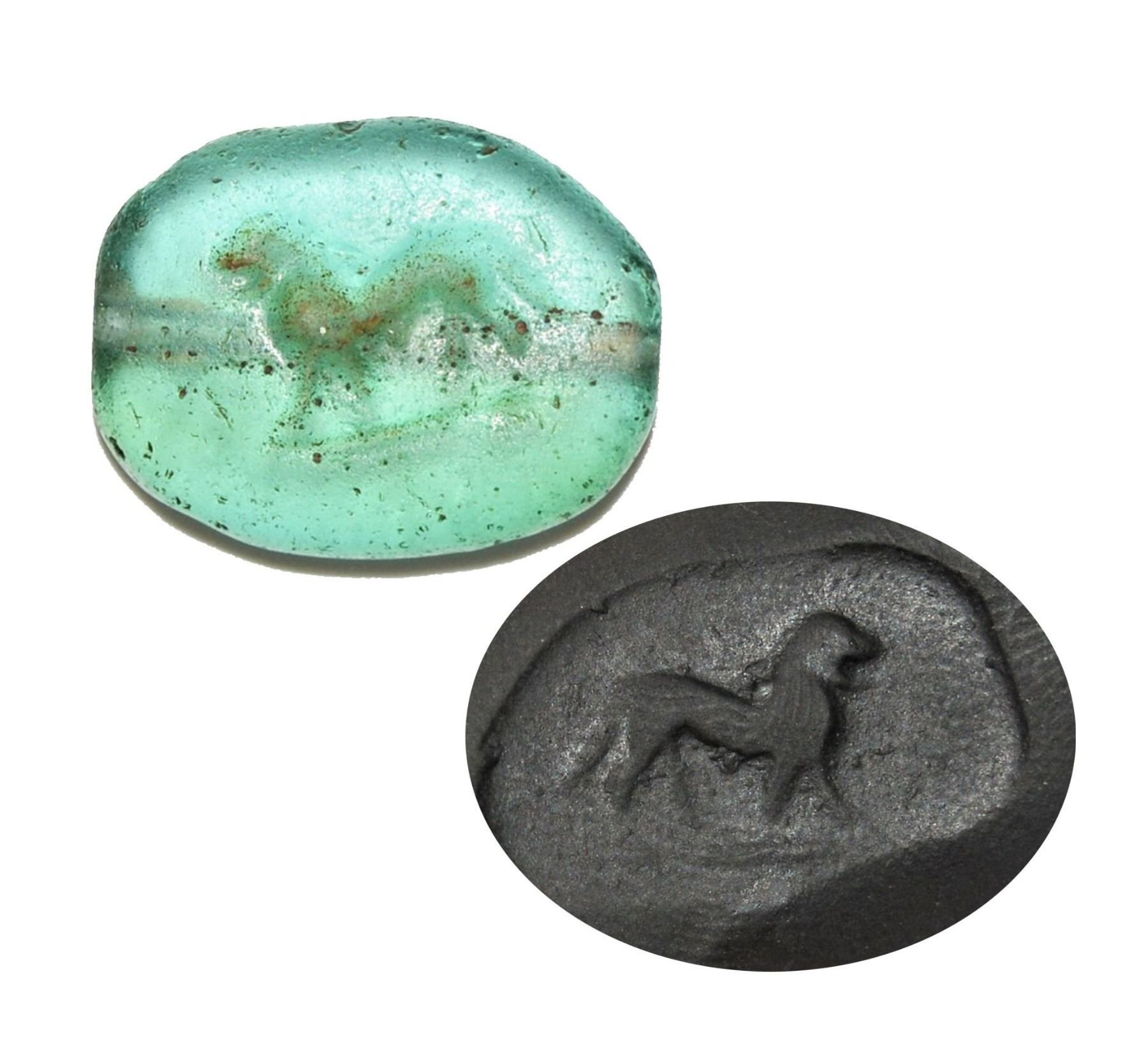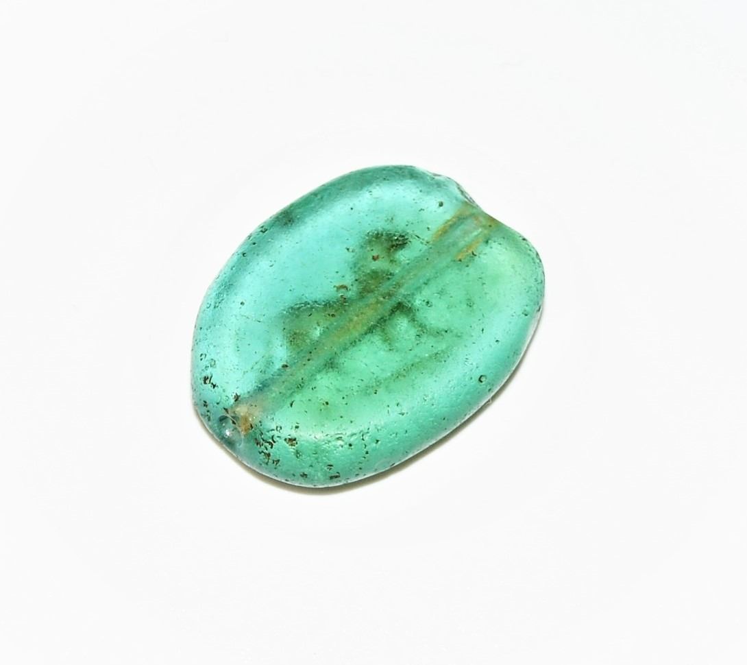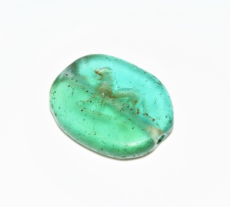 RARE & ATTRACTIVE ANCIENT ROMAN GREEN GLASS LION INTAGLIO BEAD, CIRCA 1ST-2ND CENTURY.
