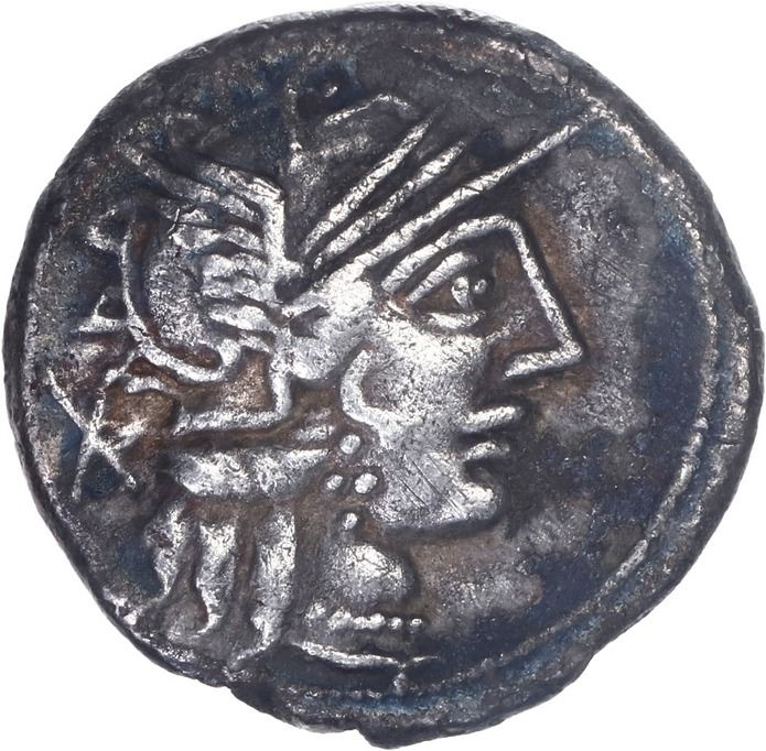 ANCIENT ROMAN, Roman Republic, AR denarius, C. Porcius Cato, 123 BC. Sydenham 417; Crawford 274/1. 3.71 grams. Helmeted head of Roma right; X behind / Victory in biga right holding reins and whip; C CATO below, ROMA in exergue. Darkly toned VF with some corrosion and sedimentation. SOLD FOR THE BENEFIT OF THE 1715 FLEET SOCIETY.