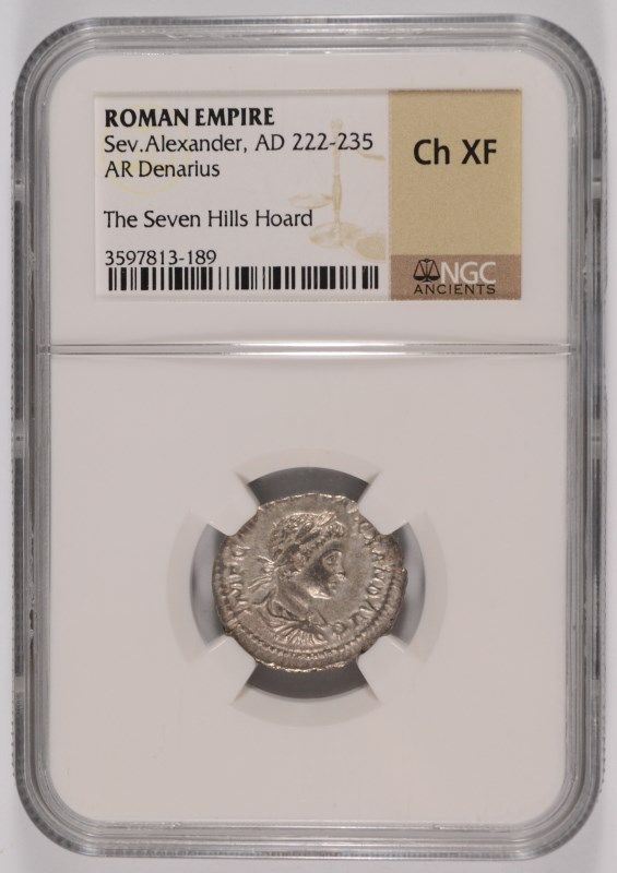 ANCIENT ROMAN SILVER DENARIUS, RULE OF SEV ALEXANDER, AD 222-235 NGC CHOICE-XF