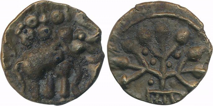 Satavahanas, Sri Satakarni, Nasik Region, Potin, 2.47g, Obv: Elephant walking to right with upraised trunk, four orb Ujjaini symbol above, Brahmi legend around, Rev: Tree in railing with large leaves within circular border. Very fine.
