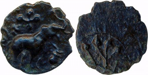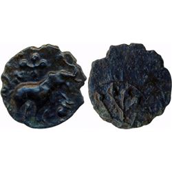 Satavahanas, Sri Satakarni, Nasik Region, Potin, 2.85g, Obv: Elephant walking to right with upraised trunk, vase in front, four orb Ujjaini symbol above, traces of Brahmi legend around, Rev: Tree in railing partly visible within circular border. Very fine.