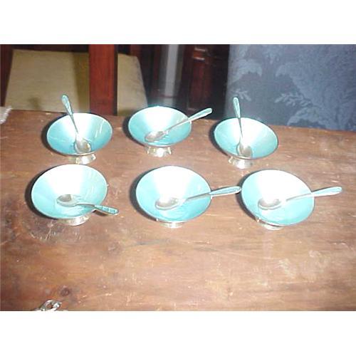 SET OF 6 SIGNED STERLING AND ENAMELED SALT CELLARS W/ SPOONS