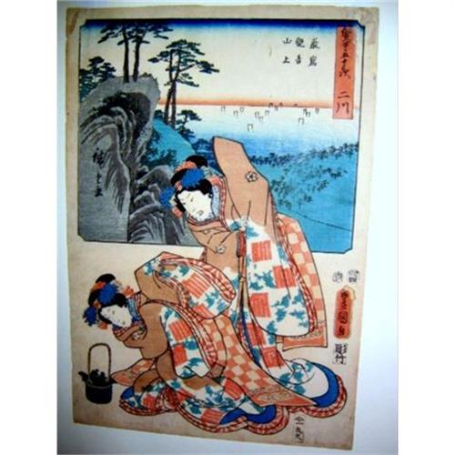 THIS WOODBLOCK IS DONE BY 2 WOODBLOCK ARTIST'S. THE BACKGROUND LANDSCAPE WAS EXECUTED BY HIROSHIE GA AND TOYOKUNI III, DID THE FIGURES IN THE FORE FRONT, TOYOKUNI III TOOK THE NAME OF HIS MASTER AFTER HIS DEATH AND BECAME KUNISADA. THESE ARE ALWAYS WONDERFUL TO OWN, THE TITLE SERIES IS KNOWN AS SO-HITSU GOJU SAN TSUGI. FULL BORDERS AND COLORS ARE RICH, CONDITION IS GREAT, PUBLISHER IS MARUKYU AND THE CENSOR SEAL IS HARE FOUR.