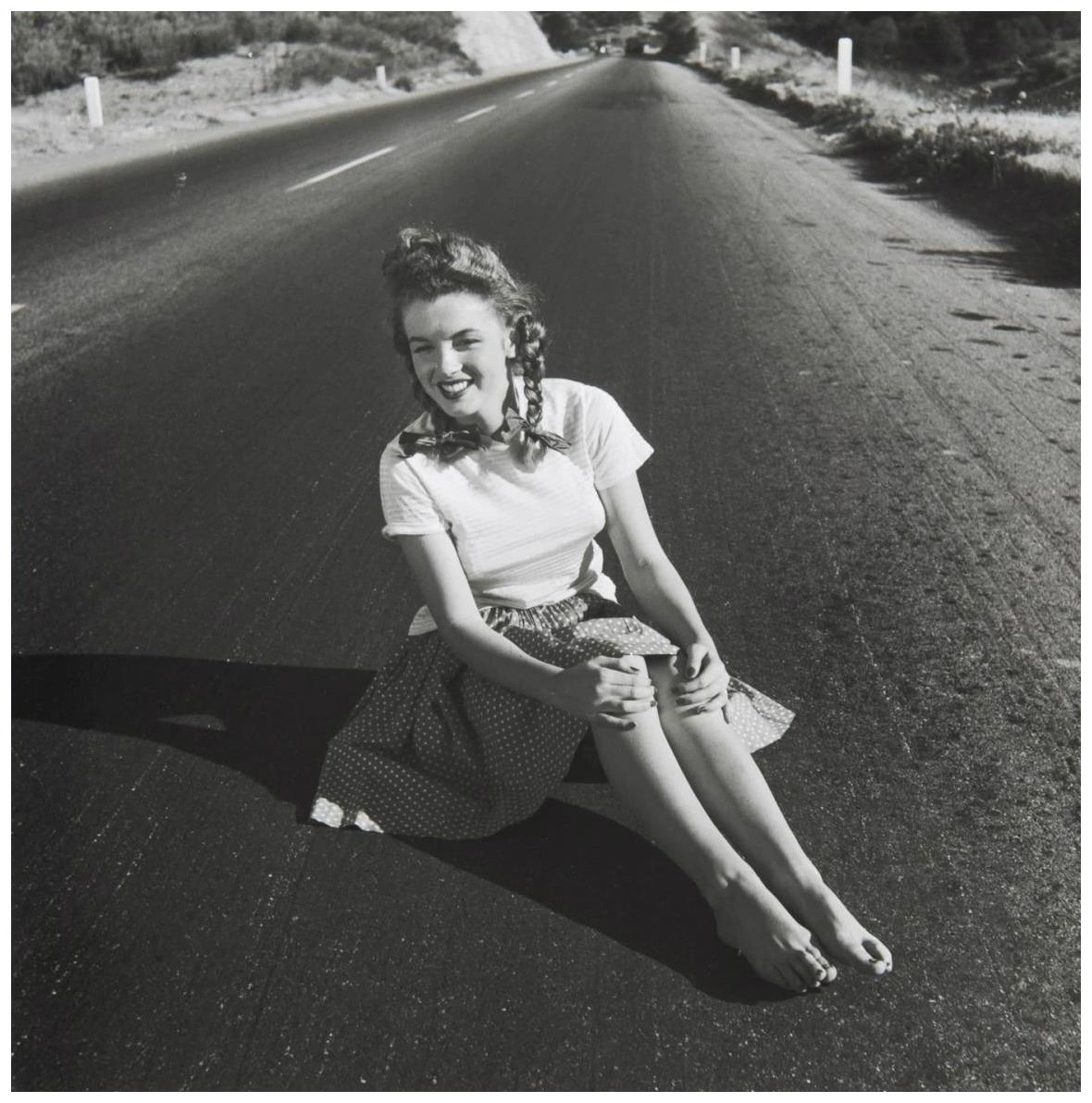 ANDRE DE DIENES - MARILYN MONROE on road side in 1945.