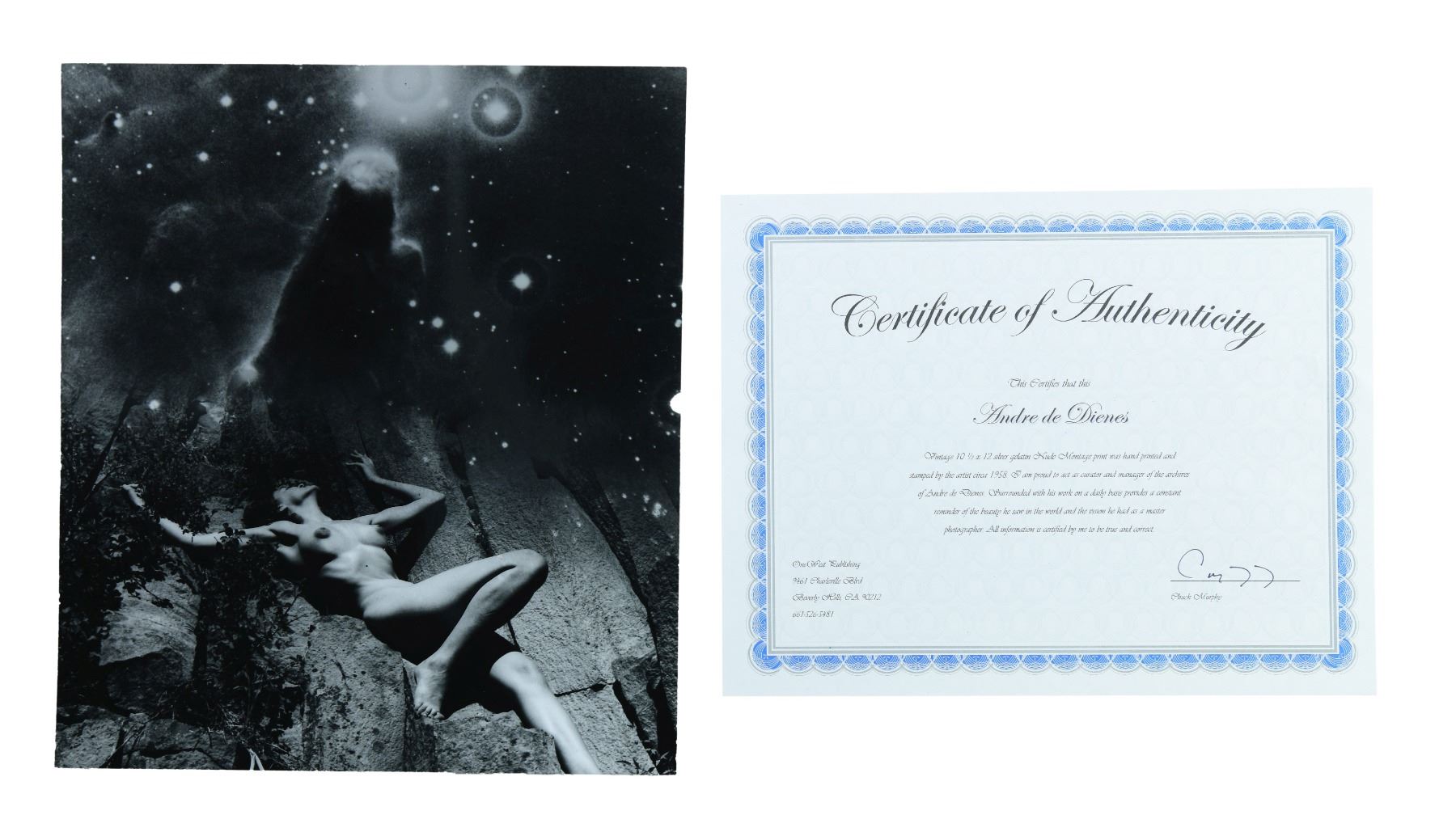 A black and white photo of a nude female posed on a rock formation with vegetation under a celestial sky. The photo is a silver gelatin print. Unframed. Photo comes with Certificate of Authenticity by Chuck Murphy. SIZE: 10 1/2" x 12". CONDITION: very good to excellent. (05-1029/TG). $400-600.