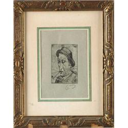 Lot # 39 ANDRE DERAIN (French, 1880-1954) PORTRAIT OF A MAN WITH HAT AND PIPE. Etching on tinted paper shows older man with black hat and long pipe with wrinkled eyes. Pencil signed “A. D.”. Housed in a decorative copper gilt frame with highlighted matte. IMAGE SIZE: 3-1/4” x 2-1/4”. SIGHT SIZE: 5-1/2” x 4”. CONDITION: Very good. 9-98778 (600-800)