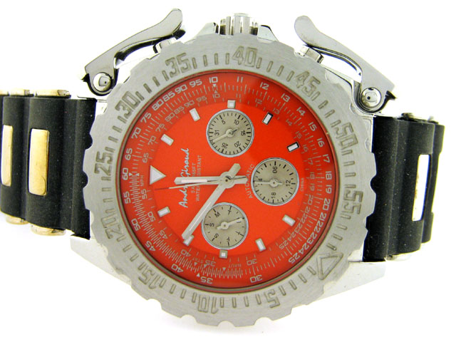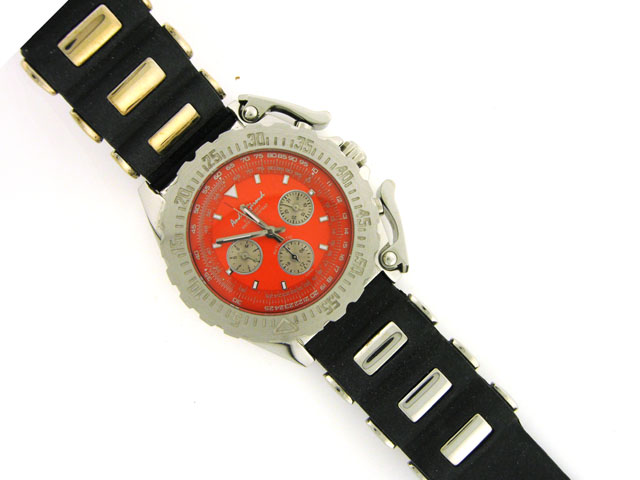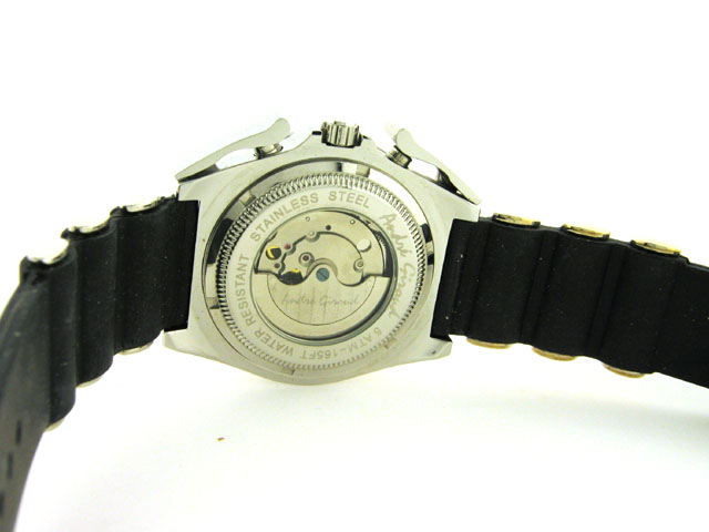 The watch has a Stainless Steel Case with a diameter of 43 mm and a rubber and silver band with clasp buckel. The Movement is Automatic. The bracelet measures 7.25 inches. The watch is Water Resitant to 5 ATM.