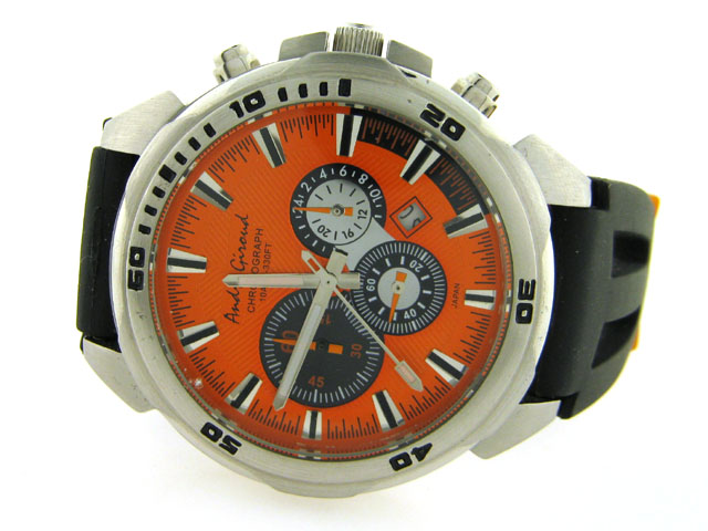 This is ANDRE GIROUD Chronograph Watch with the following features: Date functions; Rubber Material; Two tone color; Water resistant; 44 mm Case diameter; 13 mm case thickness; Stainless steel; and Chronograph functions.