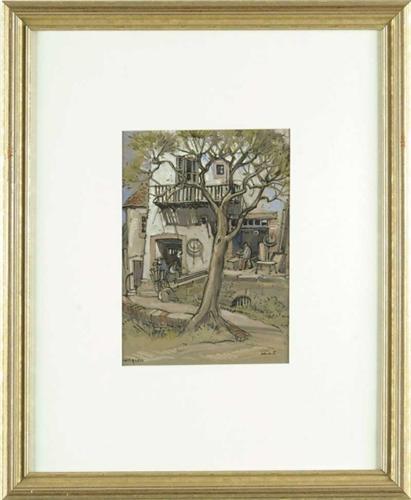ANDRE JULES SMITH (American, 1880-1959) THE COOPER'S SHOP. Watercolor French scene shows what appears to be a Cooper's shop in the bottom of a white multi-story stucco house. A man is seen in shop with barrel staves and hoops stacked. Signed lower right. Housed in a gilt molded wood frame with large white matte. SIGHT SIZE: 10-1/2" x 7-1/2". CONDITION: Very good. 9-26715