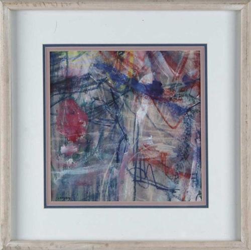 ANDRE LANSKOY (French, 1902-1976) COLORFUL ABSTRACT. Mixed media on paper colorful scene with splashes of red, blue, green and white. Housed in a white washed oak frame with triple white, blue and rose matte. Signed lower left “Lanskoy”. SIGHT SIZE: 11-1/2” x 11-1/2”. CONDITION: Very good. 9-27707
