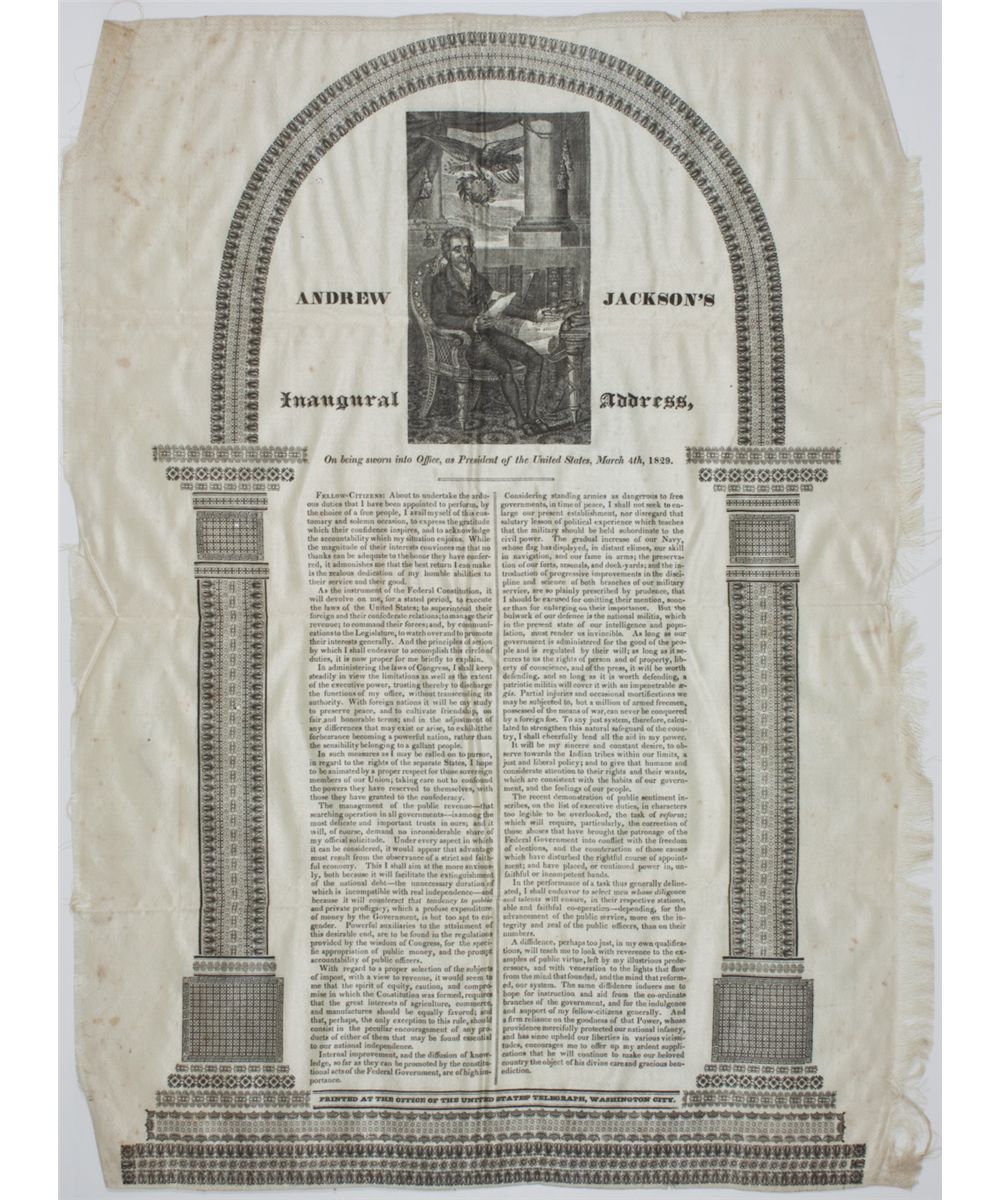 Broadside on silk, 20" x 16" featuring an engraving of a seated Jackson at top center and entitled, "ANDREW JACKSON'S Inaugural Address, On being sworn into Office, as President of the United States, March 4th, 1829." (Washington: "Printed at the Office of the United States Telegraph,", [1829]). Creases, some expected marginal fraying, else quite clean and bight. A very nice example.