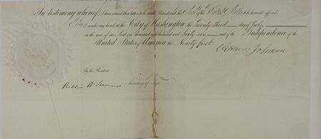 (1808-1875) Seventeenth President of the United States who came to office following the death of Abraham Lincoln. A squabble with Stanton along with his Reconstruction policies led to an impeachment by Congress. The bottom portion of a document signed as President, likely an appointment, Washington, July 23, 1866, boldly signed at right and countersigned by WILLIAM H. SEWARD as Secretary of State. Right half of document mounted to another sheet, heavy toned central fold with tear thereon. Still very good, with a fine signature suitable for removing.