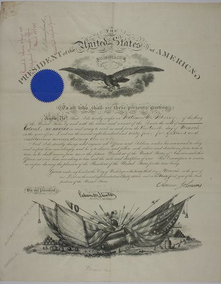 (1808-1875) Seventeenth President of the United States who came to office following the death of Abraham Lincoln. A squabble with Stanton along with his Reconstruction policies led to an impeachment by Congress. Partly-printed D.S. as president with STAMPED signature "Andrew Johnson", 1p folio parchement, Washington, Mar. 23, 1867, the appointment of WILLIAM M. WHERRY as Colonel by Brevet from Mar. 13, 1865 for "...galant and meritorious services during the war...". Co-signed by EDWIN M. STANTON whose signature is also stamped. Folds, light pencil notes at bottom, else fine. William M. Wherry (1836-1918) was awarded the Medal of Honor for his actions at the Battle of Wilson's Creek on Aug. 10, 1861, where he "displayed conspicuous coolness and heroism in rallying troops that were recoiling under heavy fire" while serving as a First Lieutenant of Co. D, 3rd Reserve Missouri Infantry.