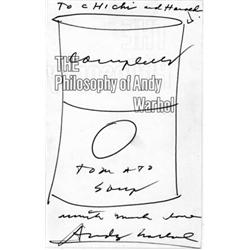 ANDY WARHOL: (1928 - 1987) American artist and the founder of pop art who gained instant notoriety with his depictions of the Campbell soup can and Brillo boxes. Excellent original signed sketch of his famous Campbell's soup can, drawn in black marker on the title page removed from his book The Philosophy of Andy Warhol, 5 1/4" x 8 1/2". War inscribes the drawing at top, draws a simple can with round label and labels it "Campbells Tomato Soup", and signs at bottom: "With much love Andy Warhol". A fine item for framing, in fine condition. $400-600