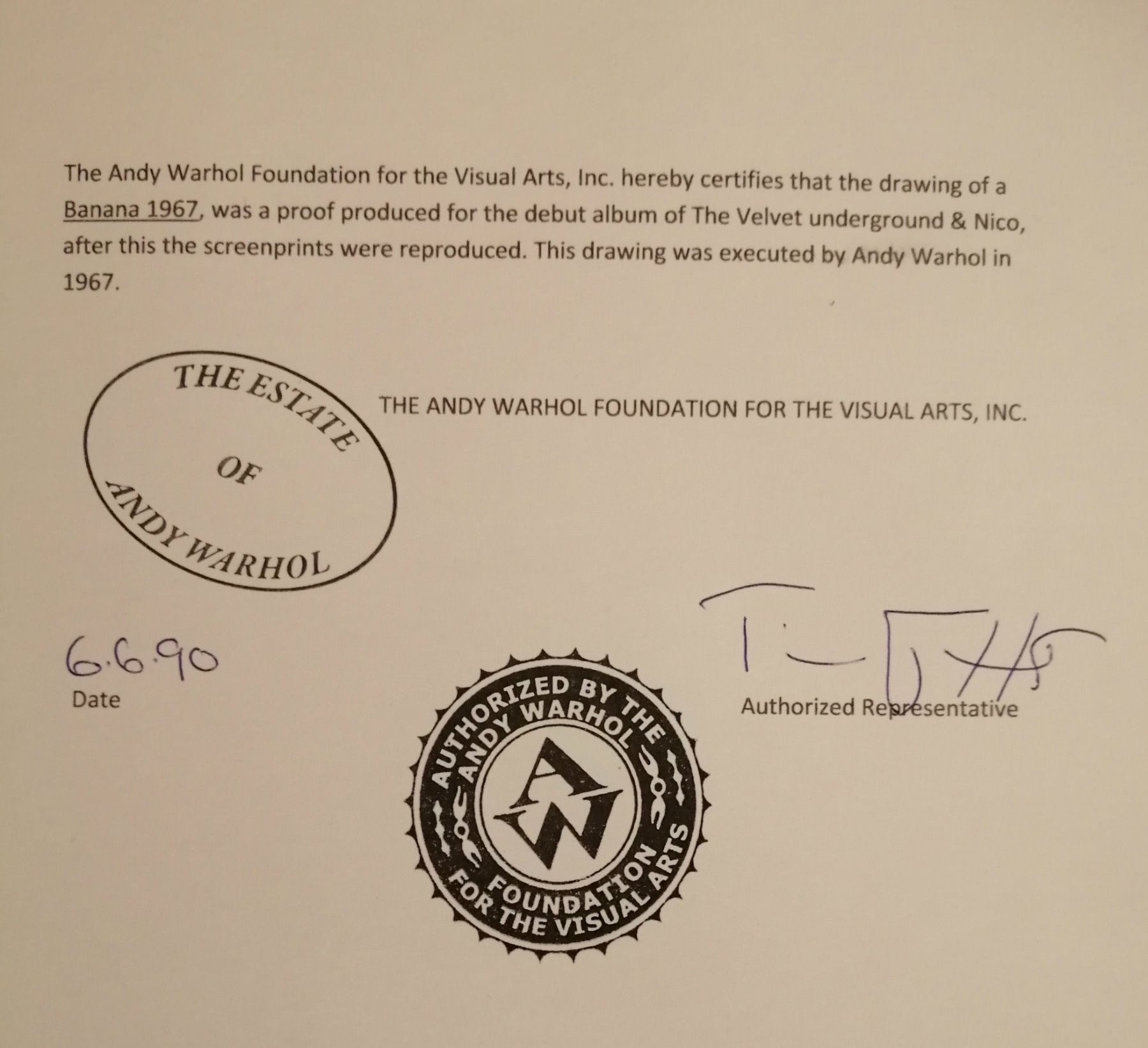 An ink drawing on card of the Banana signed by Warhol. Stamped on the verso and supplied with estate letter. There is a crease that runs through the card. Mounted and framed.