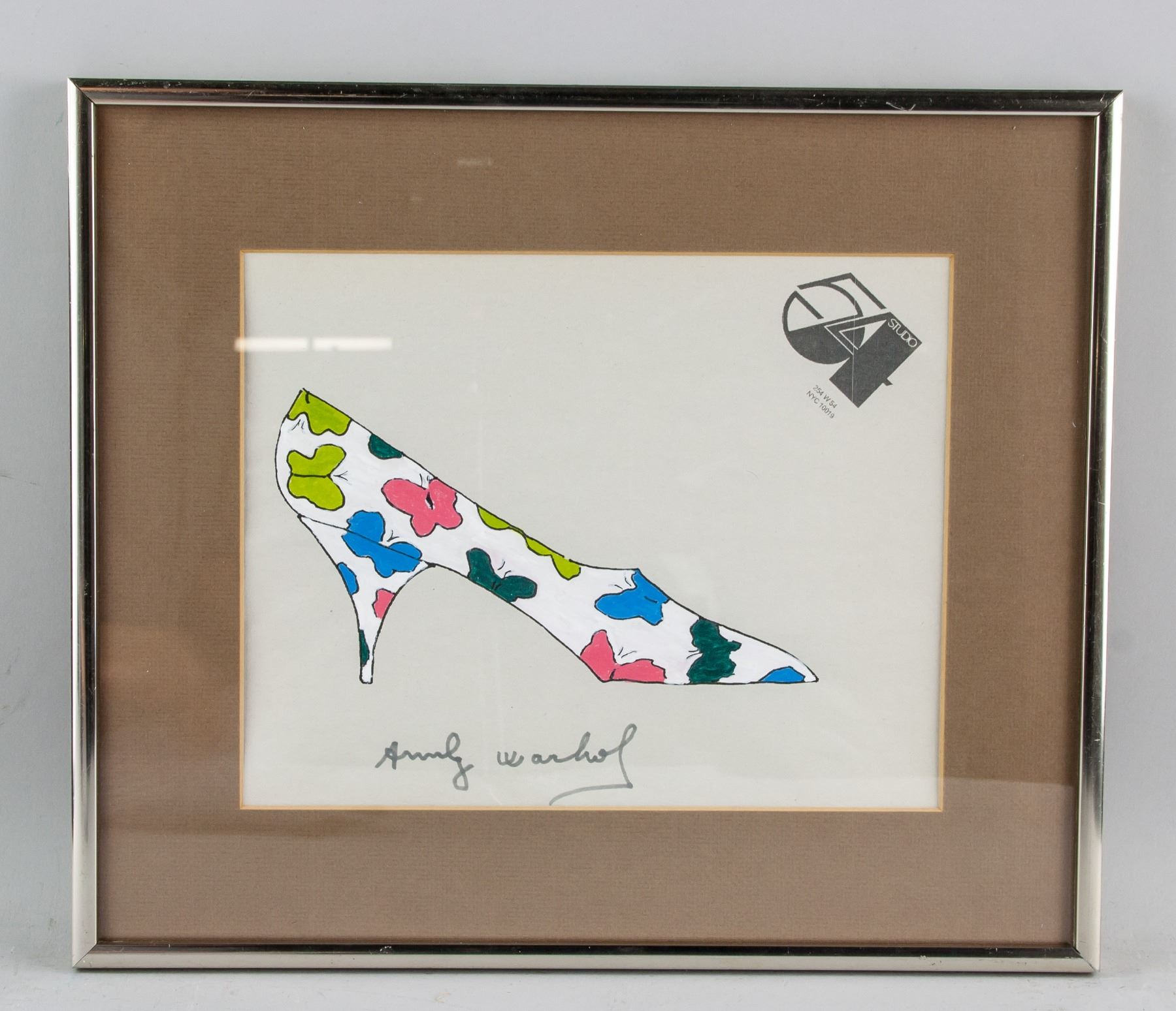 Tempera on paper. Featuring a single platform heel. Signed and attr. Andy Warhol (American, 1928-1987). 7.7 x 9.6 inch (19.5 x 24.5 cm). Obsessed with celebrity, consumer culture, and mechanical (re)production, Pop artist Andy Warhol created some of the most iconic images of the 20th century. As famous for his quips as for his art-he variously mused that “art is what you can get away with” and “everyone will be famous for 15 minutes”-Warhol drew widely from popular culture and everyday subject matter, creating works like his 32 Campbell's Soup Cans (1962), Brillo pad box sculptures, and portraits of Marilyn Monroe, using the medium of silk-screen printmaking to achieve his characteristic hard edges and flat areas of color. Known for his cultivation of celebrity, Factory studio (a radical social and creative melting pot), and avant-garde films like Chelsea Girls (1966), Warhol was also a mentor to artists like Keith Haring and Jean-Michel Basquiat. His Pop sensibility is now standard practice, taken up by major contemporary artists Richard Prince, Takashi Murakami, and Jeff Koons, among countless others. PROVENANCE: Southern Ontario Estate